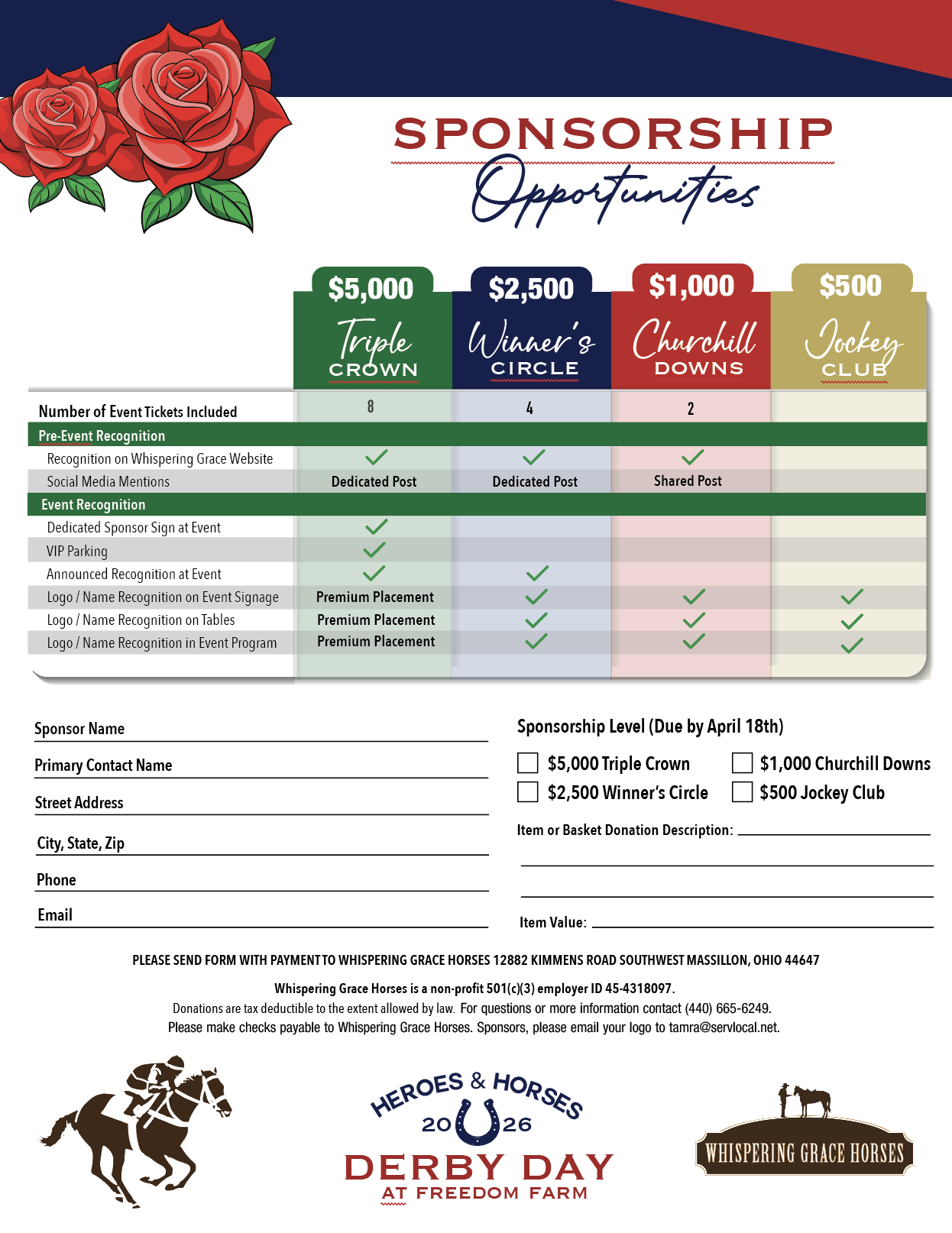 We invite businesses and community partners to be part of the inaugural Heroes & Horses Derby Day at Freedom Farm on May 2, 2026. This unique and memorable experience will raise vital support for the life-changing programs of Whispering Grace Horses. Sponsorship opportunities range from $500 to $5,000, offering meaningful brand visibility, recognition during the event, and the chance to align your organization with a mission that brings hope and healing to those who need it most.